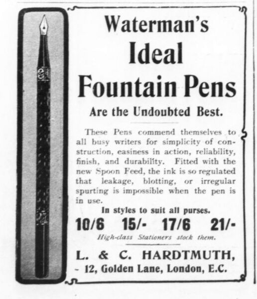 Scansione di una pubblicità Waterman datata 1901-06-01. Pubblicazione su: The Illustrated London News, vol. CXVIII, n. 3241, pag. 804. Rappresentante: "L. & C. Hardtmuth.". Indica come indirizzo: "12, Golden Lane, London, E.C.". Data dal reperimento della pagina su una versione archiviata della rivista. Pubblicità per una generica Waterman Ideal Fountain Pen, indica i prezzi 10/6, 15/-, 17/6 e 21/-. Cita lo Sppon Feed.