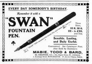 Scansione di una pubblicità Swan datata 1902-08-02. Pubblicazione su: The Illustrated London News, vol. CXXI, n. 3302, pag. 184. Riferimento all'azienda come: "Mabie, Todd, & Bard". Indica come indirizzo: "93, Cheapside, E.C.". Data dal reperimento della pagina su una versione archiviata della rivista. Puublicata anche su: vol. CXXI, n. 3310, (1902-09-27), p. 477; vol. CXXI, n. 3322, (1902-12-20), p. 970; vol. CXXII, n. 3330, (1903-02-14), p. 253; vol. CXXII, n. 3340, (1903-04-25), p. 640; vol. CXXII, n. 3348, (1903-06-20), p. 965; vol. CXXIII, n. 3356, (1903-08-15), p. 252; vol. CXXIV, n. 3376, (1904-01-02), p. 35; vol. CXXIV, n. 3384, (1904-02-27), p. 323; vol. CXXIV, n. 3392, (1904-04-23), p. 630. Pubblicizza una stilografica Swan Pen, cita tre dimensioni prezzate rispettivamente 10/6, 16/6 e 25/- fino a £20.