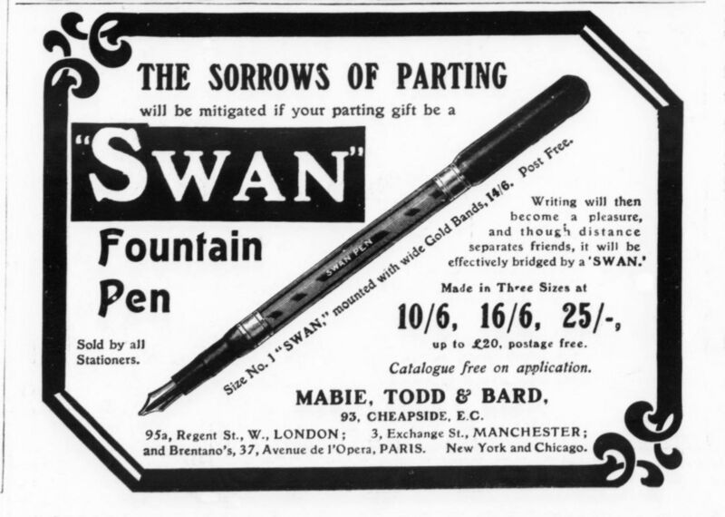 Scansione di una pubblicità Swan datata 1904-07-02. Pubblicazione su: The Illustrated London News, vol. CXXV, n. 3402, pag. 32. Riferimento all'azienda come: "Mabie, Todd, & Bard". Indica come indirizzo: "93, Cheapside, E.C.". Data dal reperimento della pagina su una versione archiviata della rivista. Pubblicata anche su: vol. CXXV, n. 3406, (1904-07-30), p. 171; vol. CXXV, n. 3410, (1904-08-27), p. 313. Pubblicizza una stilografica Swan Pen, cita tre dimensioni prezzate rispettivamente 10/6, 16/6 e 25/- fino a £20.