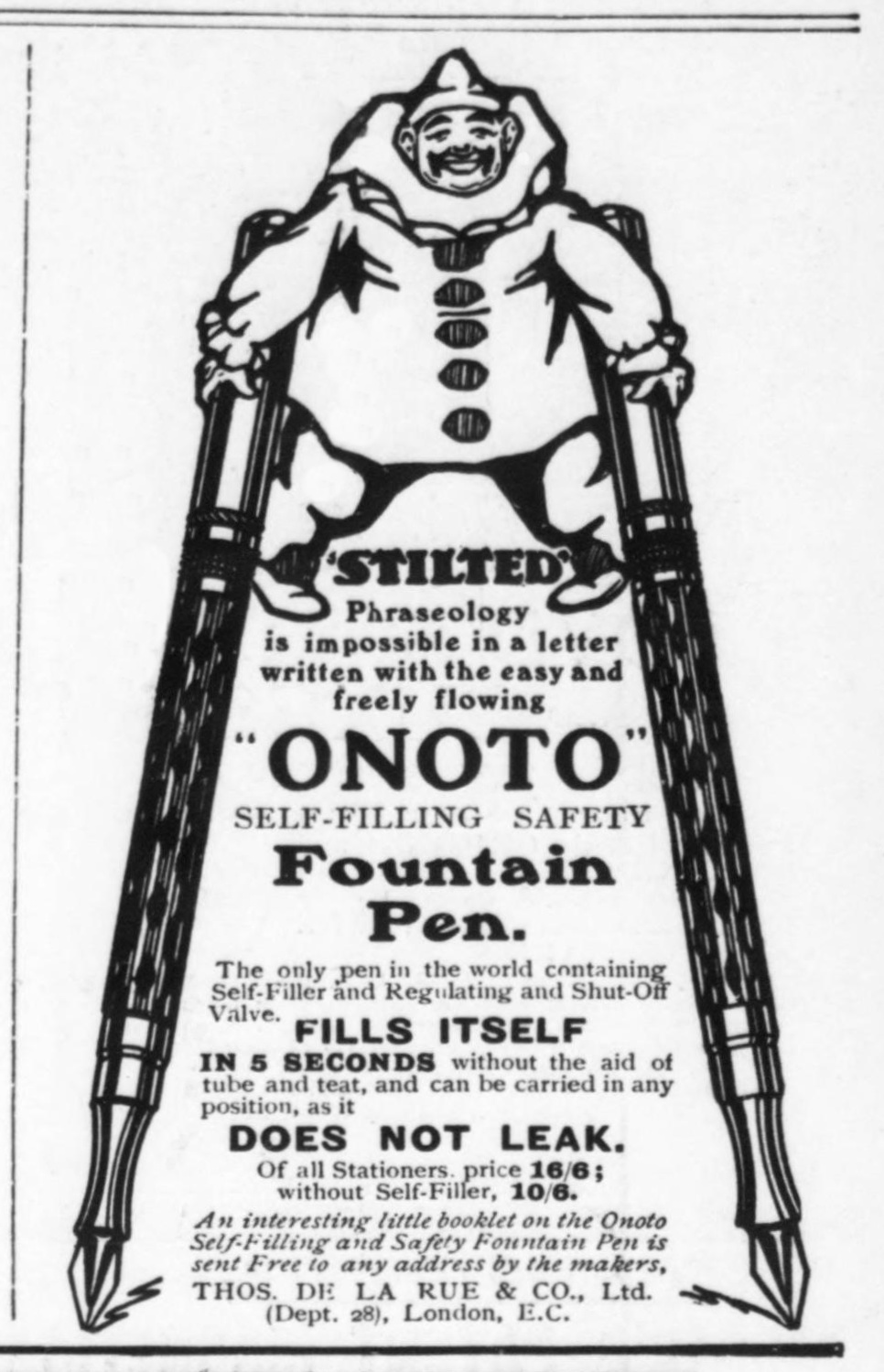 Scansione di una pubblicità Onoto datata 1906-02-24. Pubblicazione su: The Illustrated London News, vol. CXXVIII, n. 3488, pag. 296. Riferimento all'azienda come: "Thomas De La Rue & Co., Ltd.". Indica come indirizzo: "London, E.C.". Usa lo slogan: "Fill itself in 5 seconds". Data dal reperimento della pagina su una versione archiviata della rivista. Pubblicizza le prime stilografiche a marchio Onoto chiamate genericamente "Self-Filling Safety Fountain Pen".