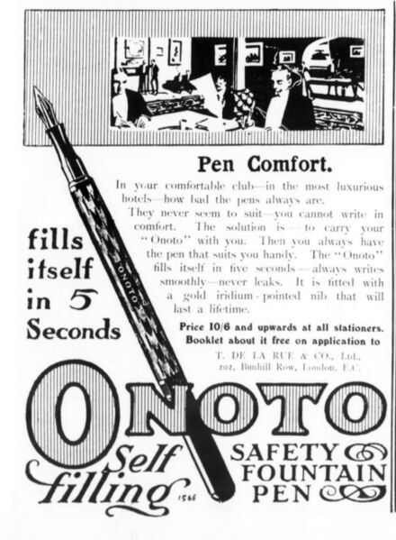 Scansione di una pubblicità Onoto datata 1907-12-14. Pubblicazione su: The Illustrated London News, vol. CXXXI, n. 3582, pag. 886. Riferimento all'azienda come: "T. De La Rue & Co. Ltd.". Indica come indirizzo: "202, Bunhill Row, London, E.C.". Data dal reperimento della pagina su una versione archiviata della rivista. Pubblicizza le prime stilografiche a marchio Onoto chiamate genericamente "Self-Filling Safety Fountain Pen".