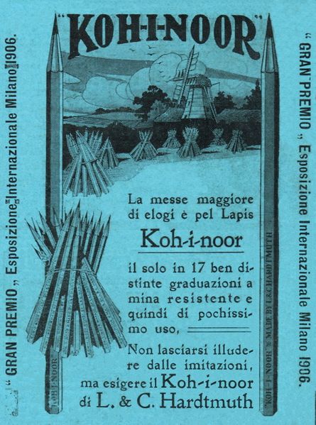 Scansione di una pubblicità Hardtmuth datata 1906-12. Pubblicazione su: L'Illustrazione Italiana. Ritoccata dall'autore per una migliore nitidezza. Contributo di Giorgio (utente forum Musicus). Data ottenuta da quella di pubblicazione del volume da cui la pagina è estratta. Pubblicizza i lapis dell'azienda.