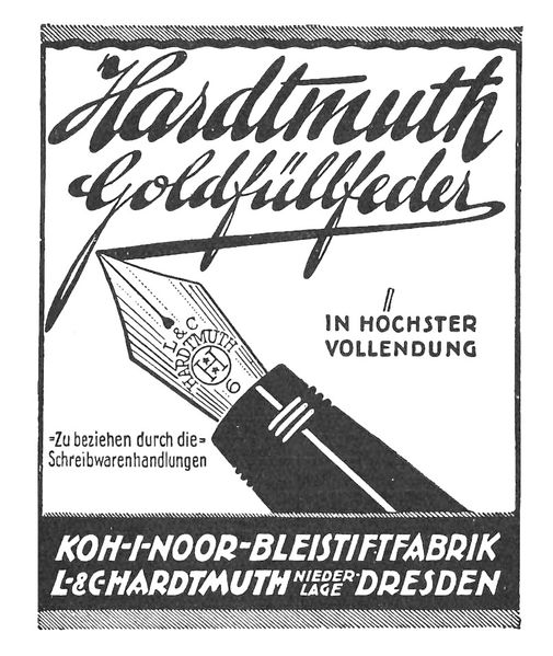 Scansione di una pubblicità Hardtmuth datata 1928-11. Pubblicazione su: Velhagen und Klasings Monatshefte, anno XVIII, n. 11, pag. 35. Contributo di Giorgio (utente forum Musicus). Data ottenuta da quella di pubblicazione del volume da cui la pagina è estratta. Pubblicizza i pennini della ditta.