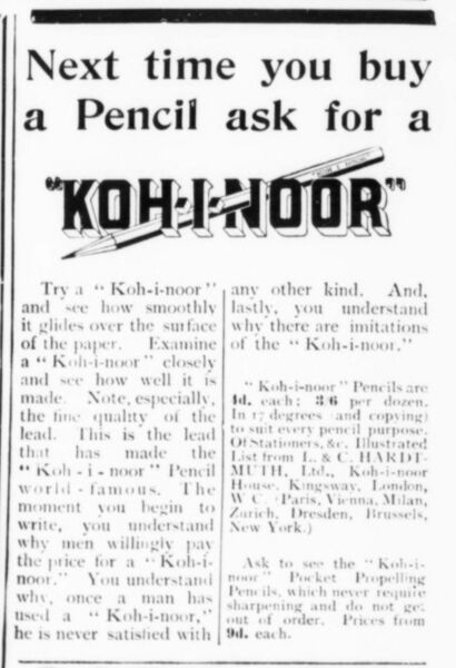 Scansione di una pubblicità Hardtmuth datata 1911-12-16. Pubblicazione su: The Illustrated London News, vol. CXXXIX, n. 3791, pag. 1072. Riferimento all'azienda come: "L. & C. Hardtmuth.". Data dal reperimento della pagina su una versione archiviata della rivista. Pubblicità per le matite Koh-i-Noor.