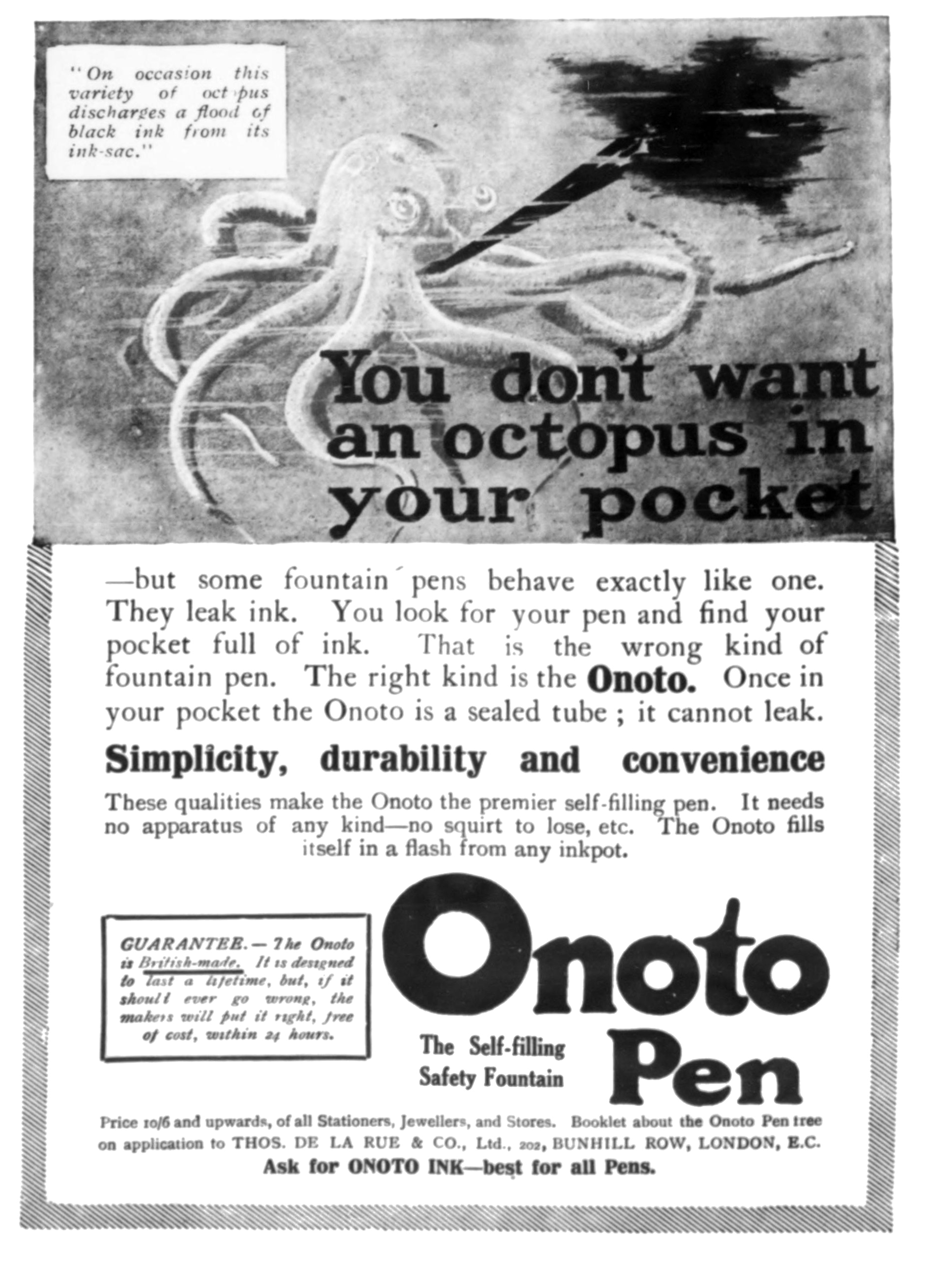 Scansione di una pubblicità Onoto datata 1912-11-23. Pubblicazione su: The Illustrated London News, vol. CXLI, n. 3840, pag. 778. Riferimento all'azienda come: "Thomas De La Rue & Co., Ltd.". Indica come indirizzo: "202, Bunhill Row, London, E.C.". Data dal reperimento della pagina su una versione archiviata della rivista. Pubblicizza le prime stilografiche a marchio Onoto chiamate genericamente "Self-Filling Safety Fountain Pen". Cita l'Onoto Ink.