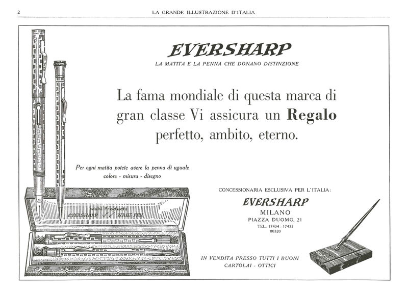 Scansione di una pubblicità Eversharp datata 1931-01. Pubblicazione su: La Grande Illustrazione d'Italia, anno VIII, n. 1, pag. 2. Contributo di Giorgio (utente forum Musicus). Data ottenuta da quella di pubblicazione del volume da cui la pagina è estratta. Pubblicità di una Wahl Engine Turned nella lavorazione Grecian Border.