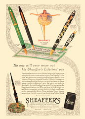 Scansione di una pubblicità Sheaffer datata 1930-05-10. Pubblicazione su: The Literary Digest, vol. 105, n. 6. Ritoccata dall'autore per una migliore nitidezza. Data riportata sul retro del foglio. Pubblicizza il modello Balance e la garanzia a vita Lifetime. Mostra anche uno stiloforo e la boccetta Safety Skrip. Menziona il White dot