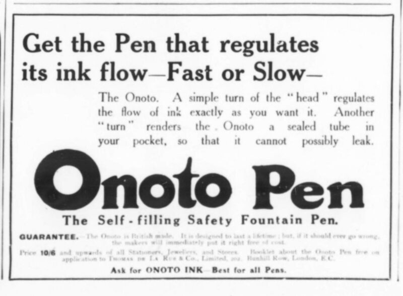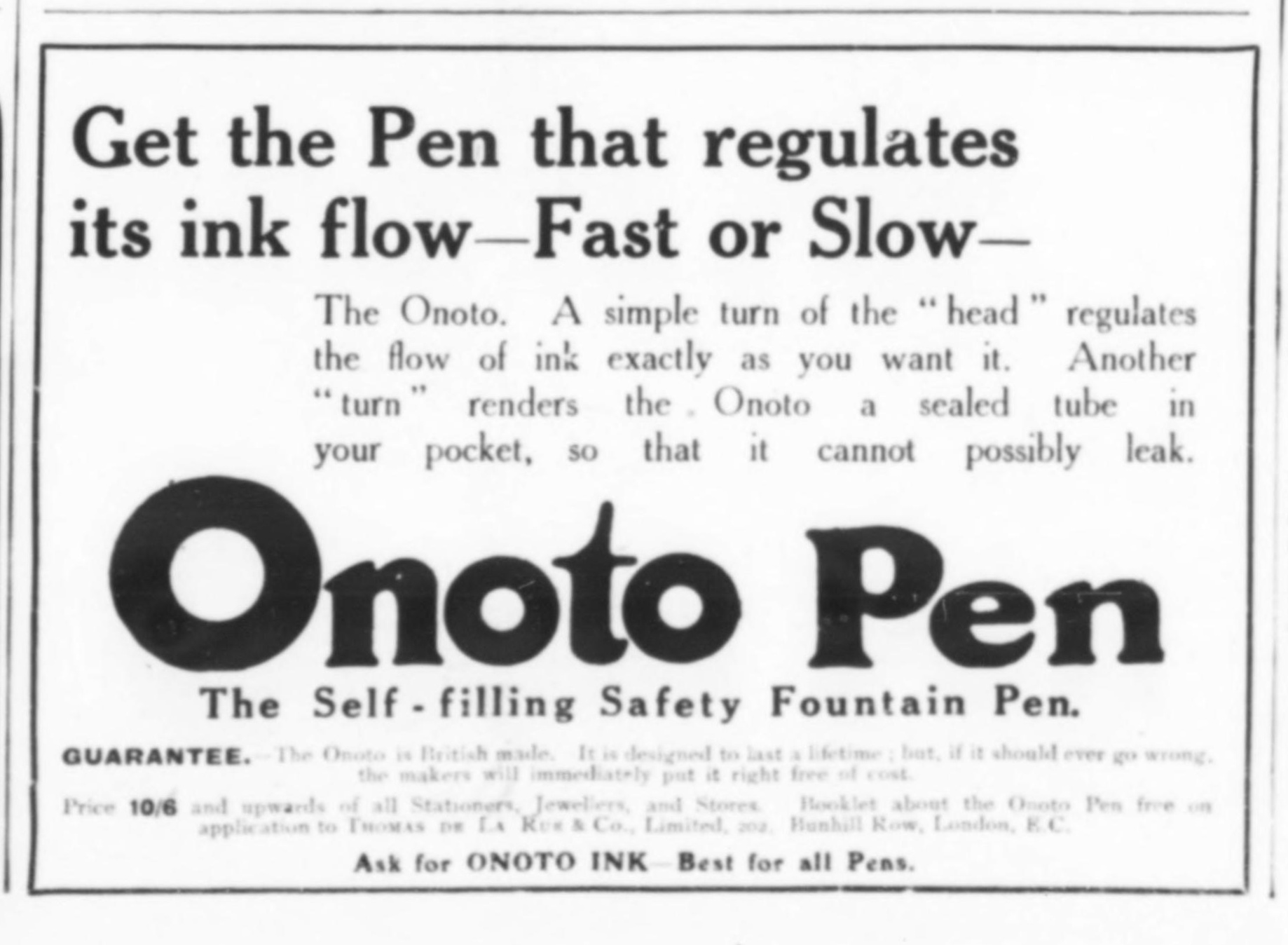 Scansione di una pubblicità Onoto datata 1913-10-04. Pubblicazione su: The Illustrated London News, vol. CXLIII, n. 3885, pag. 539. Riferimento all'azienda come: "Thos. De La Rue & Co. Limited". Indica come indirizzo: "202, Bunhill Road, London, E.C.". Data dal reperimento della pagina su una versione archiviata della rivista. Pubblicata anche su: vol. CXLIII, n. 3886, (1913-10-11), pag. 583. Pubblicizza le prime stilografiche a marchio Onoto chiamate genericamente "Self-Filling Safety Fountain Pen".