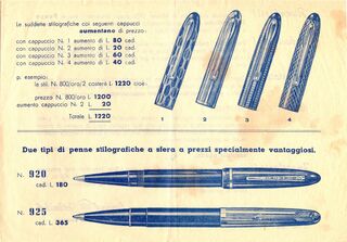 Scanning of a brochure from Original Goldmichel dated 1950-10. Retouched by the author for a better sharpness. Date directly visible. Third page, internal right. Front face, Showing caps for the N.800 and N.920 and N.925 ballpens. On the other side of File:1950-04-OriginalGoldmichel-Brochure-p04.jpg.