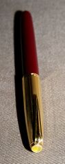 Foto di una penna DP2. Modello: DP2 Sport. Caricamento a cartuccia. Realizzazione in resina plastica borgogna. Versione Sport, con cappuccio laminato a righe. Contributo di Massimo (utente forum maxpop55).