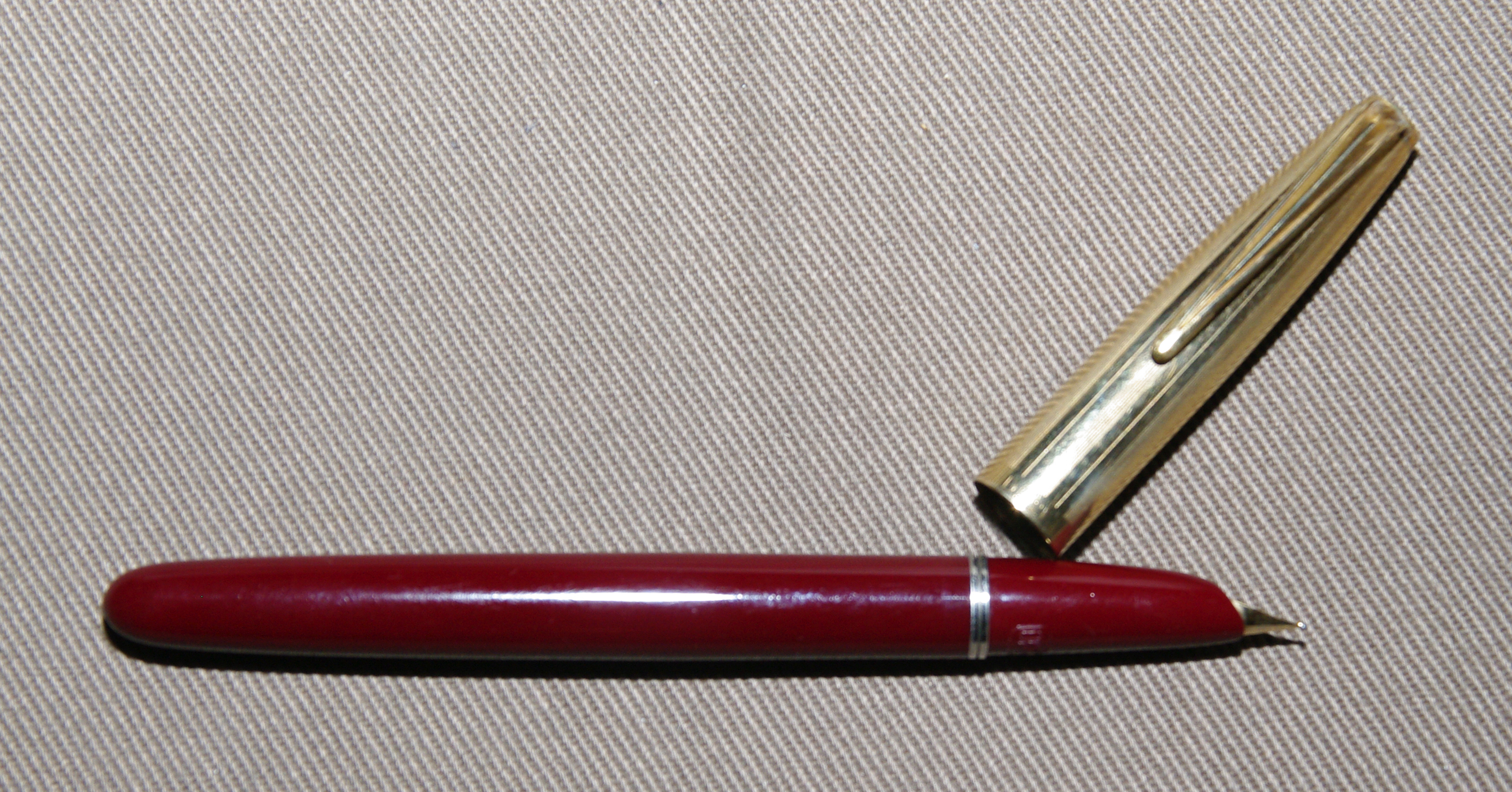 Foto di una penna DP2. Modello: DP2 Sport. Caricamento a cartuccia. Realizzazione in resina plastica borgogna. Versione Sport, con cappuccio laminato a righe. Contributo di Massimo (utente forum maxpop55).