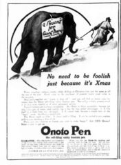 Scansione di una pubblicità Onoto datata 1913-12-13. Pubblicazione su: The Illustrated London News, vol. CXLIII, n. 3895, pag. 1025. Riferimento all'azienda come: "Thomas De La Rue & Co.". Data visibile direttamente. Pubblicizza le prime stilografiche a marchio Onoto chiamate genericamente "Self-Filling Safety Fountain Pen".