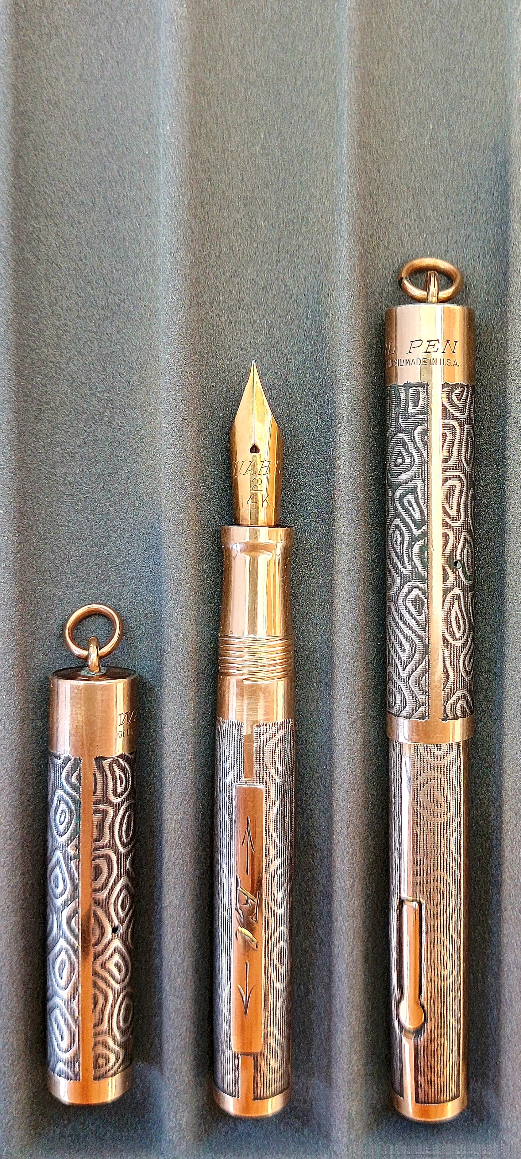 Photo of a pen produced by Eversharp. Model: Wahl Metal Pen. Filling system: lever filler. In engine turned enameled vermeil. Short size, in the Niagara pattern, also called "brain" or "coral".