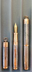 Foto di una penna Eversharp. Modello: Wahl Metal Pen. Caricamento a levetta. Realizzazione in vermeil con lavorazione guilloché e smalto. Misura piccola, da signora, nella lavorazione Niagara, detta anche "brain" o "coral". Contributo di Giorgio (utente forum Musicus).