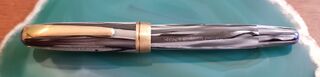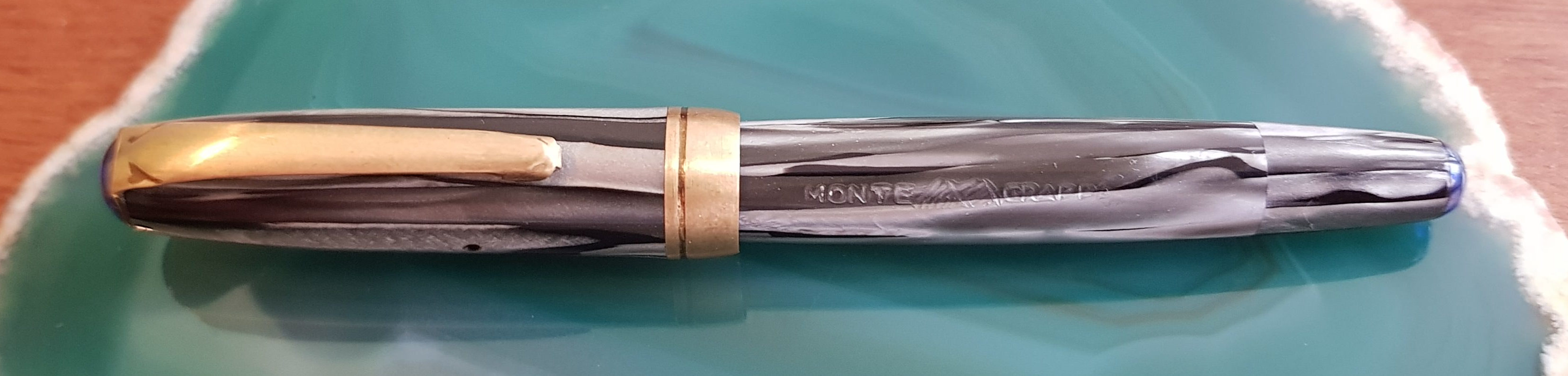 Foto di una penna Montegrappa. Modello: Montegrappa 302. Caricamento a pulsante di fondo. Realizzazione in celluloide striata grigia. Versione con inserti blu trasparenti alle estremità. Contributo di roccopin (utente forum roccopin).