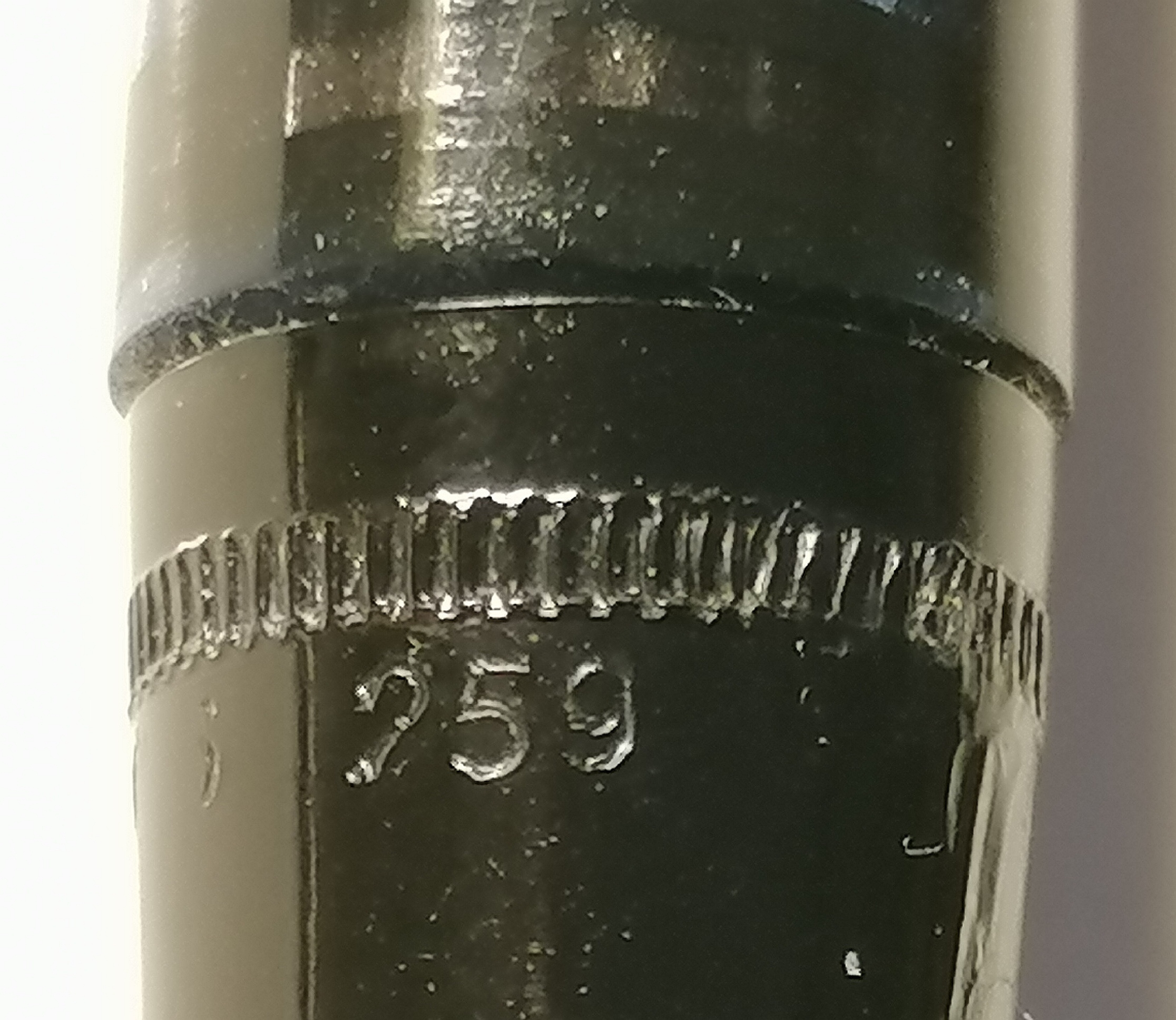 Foto di uno stiloforo Montegrappa. Modello: Montegrappa Extra 259. Caricamento a stantuffo. Realizzazione in celluloide anellata blu. Dettaglio del fondello. Pennino Montegrappa marcato Comit. Contributo di Lucio, (utente forum Lucio54).