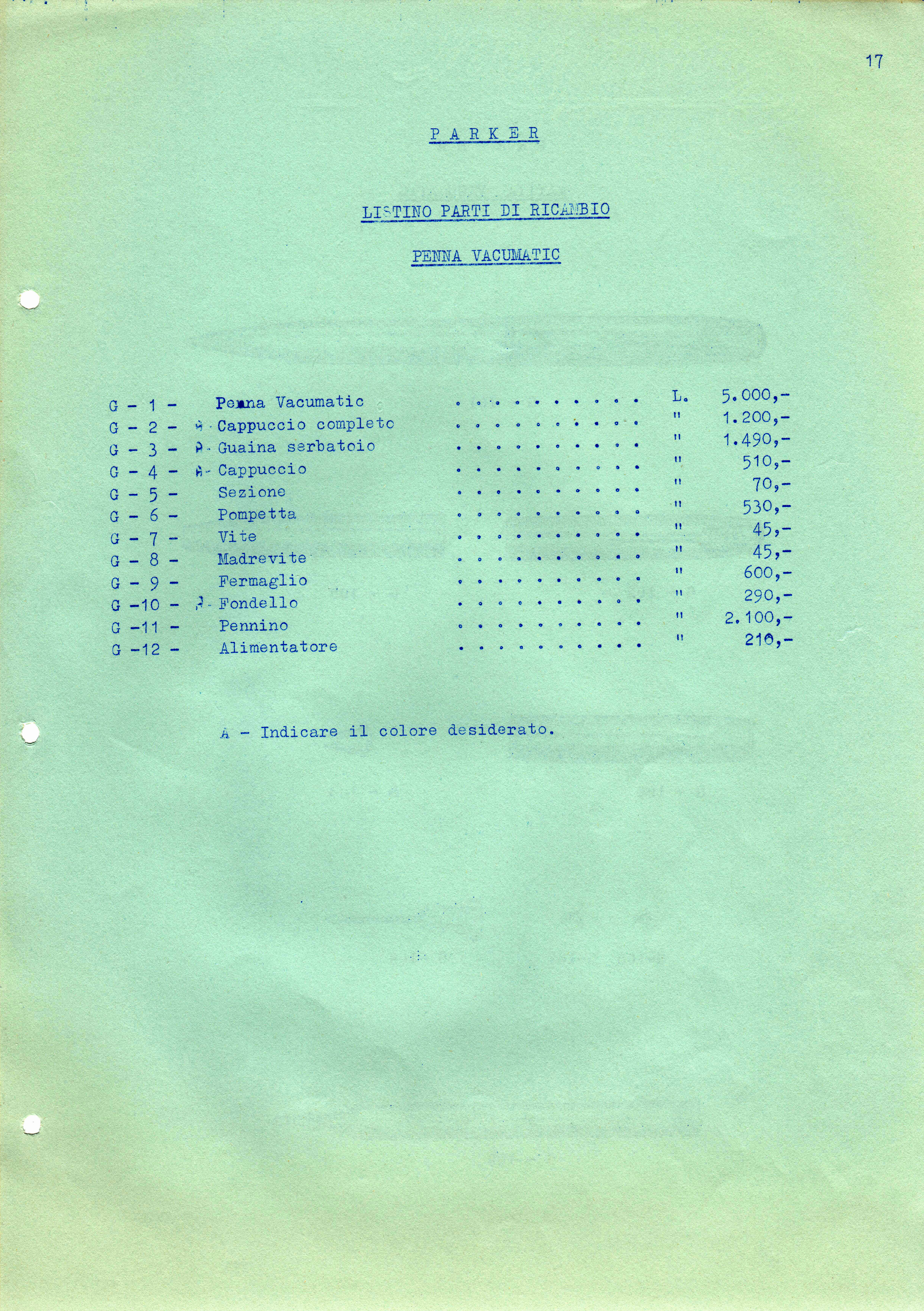 Scanning of a listing from Parker dated 1953. Retouched by the author for a better sharpness. Date reported on another page. Price list of the Italian importer "A.P.I.", exclusive dealer for Italy. Fiftheenth page, price list of spare parts for the Vacumatic Junior. On the other side of File:1953-Parker-Listino-API-P18-19.jpg.