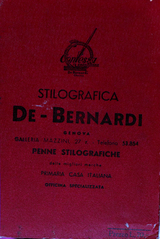 Scansione di un annuario del 1942. Tratta da: "Annuario Genovese - Guida di Genova", anno 1942-43 (pag. IV di copertina), edito da "Fratelli Pagano". Concerne le aziende: Contessa. Retro della copertina, pubblicità della "Stilografica De-Bernardi" con il marchio Contessa.