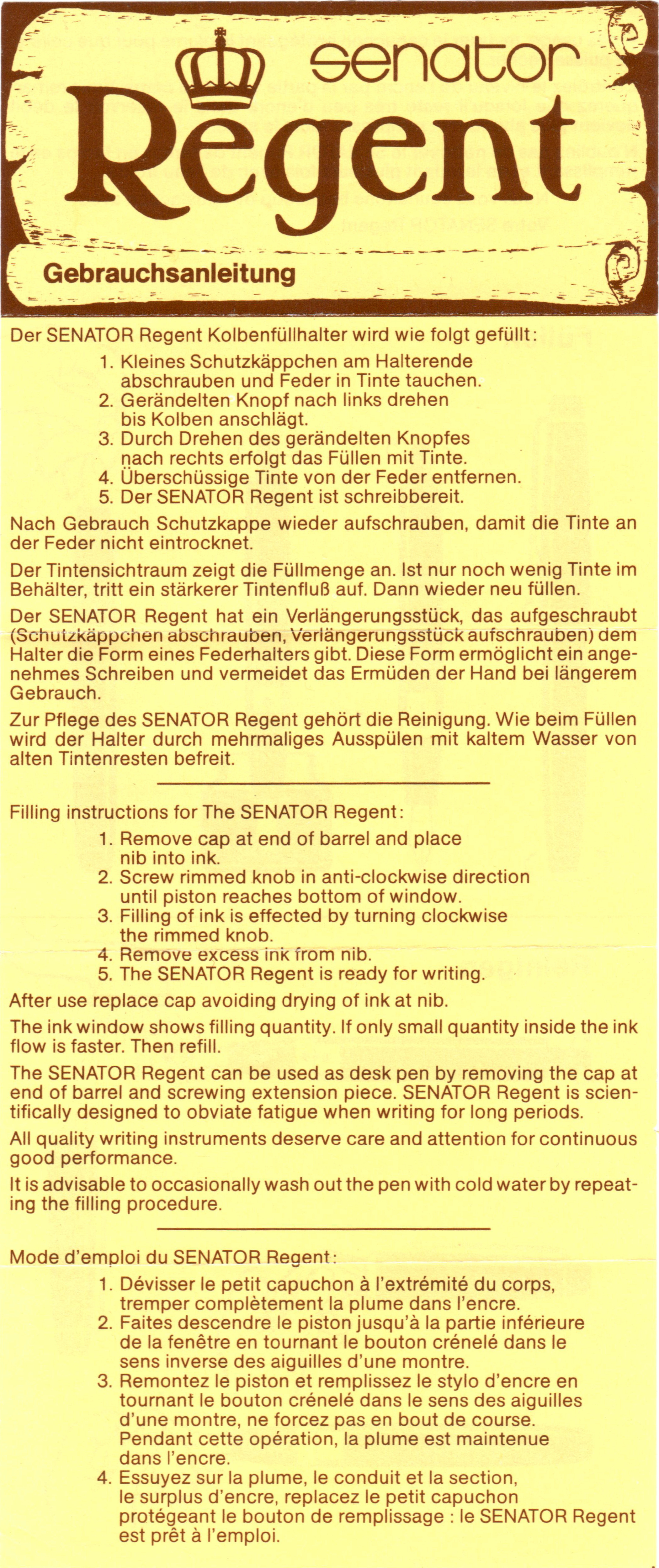 Scanning of a Senator an instruction sheet from '60s. For a Regent model. Filling instructions, external. On the other side of File:196x-Senator-Regent-Piston-Instro-Int.jpg. Contributed by David Parisi (utente forum pencilator). From an original package.