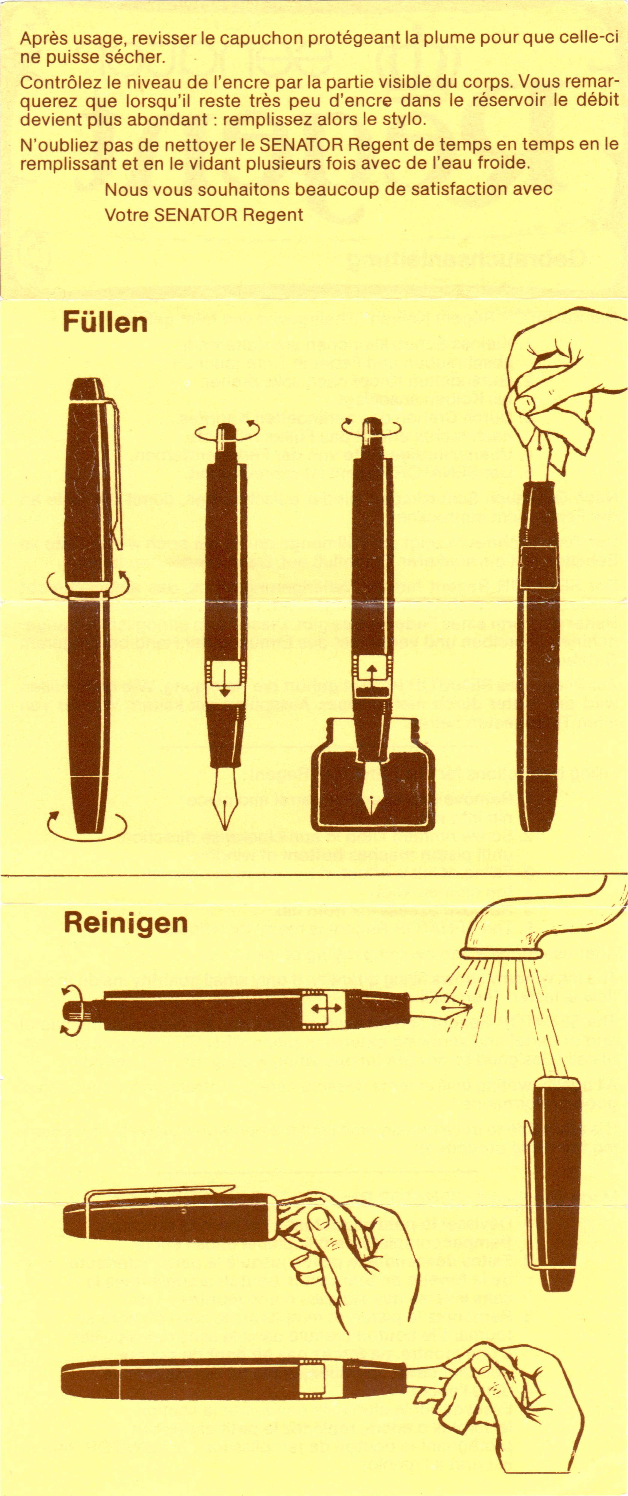 Scansione di un foglietto di istruzioni Senator degli anni '60. Relativo ad un modello Regent. Istruzioni di caricamento, interno. Sull'altro lato di File:196x-Senator-Regent-Piston-Instro-Ext.jpg. Contributo di David Parisi (utente forum pencilator). Da una confezione originale.