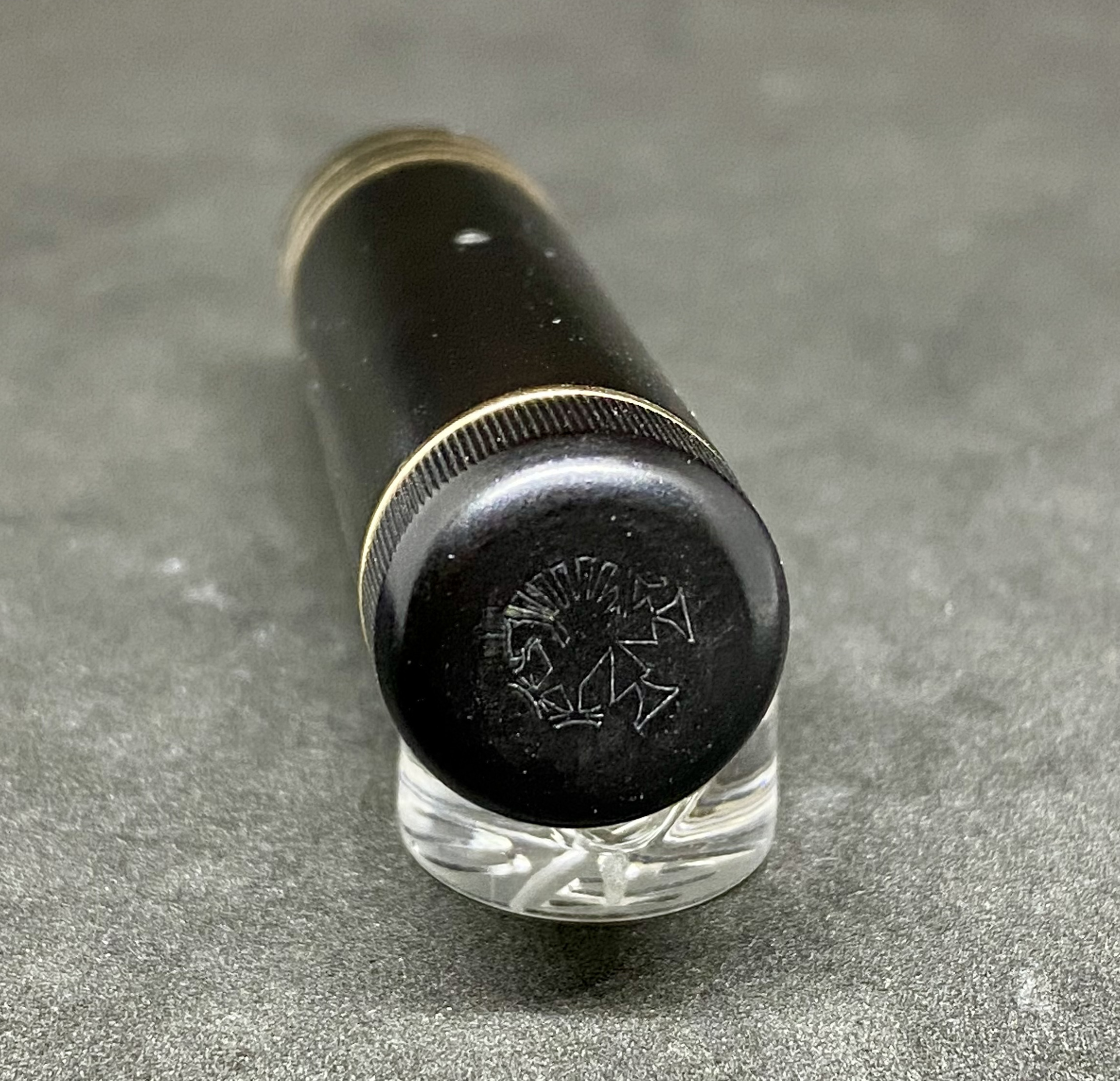 Photo of a pen/pencil set produced by Greif. Model: 3 Ring. Filling system: button filler. In black hard rubber. Detail of cap head. Biggest version, three rings on cap.