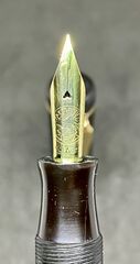 Foto di una penna Greif. Modello: 3 Ring. Caricamento a pulsante di fondo. Realizzazione in ebanite nera. Dettaglio del pennino. Versione più grande, con tre anelli sul cappuccio. Contributo di Francesco (utente forum francoiacc).