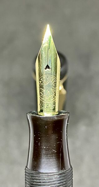 Photo of a pen produced by Greif. Model: 3 Ring. Filling system: button filler. In black hard rubber. Detail of nib. Biggest version, three rings on cap.