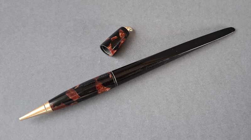 Photo of a pencil produced by Parker. Model: Duofold. In Burgundy and Black marbled celluloid. Vest pocket version, with "Envelopener".