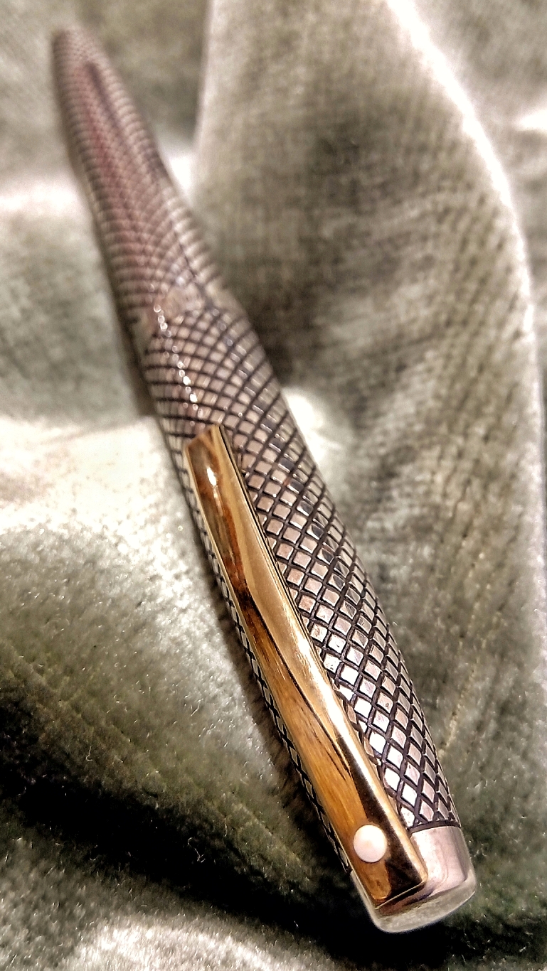 Foto di una penna Sheaffer. Modello: Sheaffer Imperial. Caricamento "Touch Down". Realizzazione con rivestimento in argento con motivo a diamanti. Versione di lusso in argento. Contributo di Gustavo, (utente forum gfrico2000).