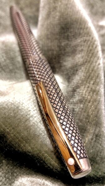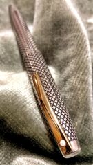 Photo of a pen produced by Sheaffer. Model: Sheaffer Imperial. Filling system: Touch Down. With diamond pattern engraving sterling silver overlay. Luxury sterling version.