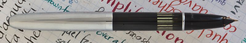Foto di una penna Aurora. Modello: Aurora 88K. Caricamento a stantuffo. Versione con cappuccio cromato e testina a vite nera. Seriale 2156941.