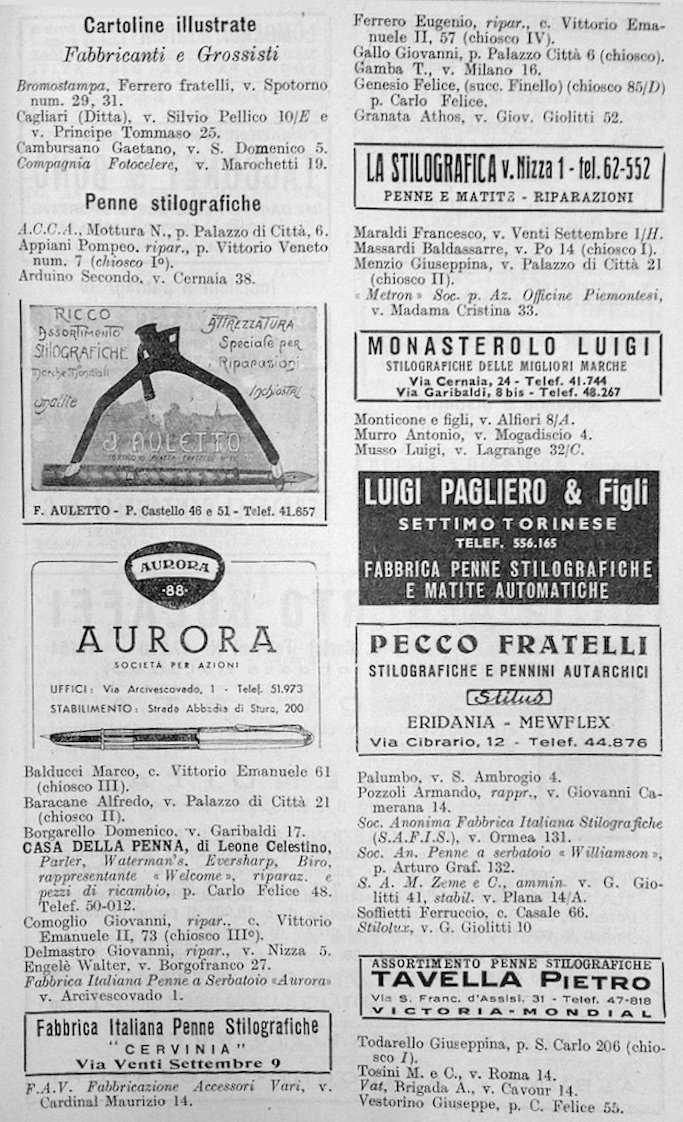 - "Pecco Fratelli", via Cibrario 12, stabilimento in Caluso (Aré), per "stilografiche e pennini autarchici", cita "Stilus - Eridania - Mewflex";