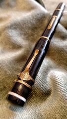 Foto di una penna Météore. Caricamento a levetta. Realizzazione in ebanite nera. Modello degli anni 20, con accommodation clip, bague blanche ed il marchio "Unis France". Contributo di Gustavo, (utente forum gfrico2000).