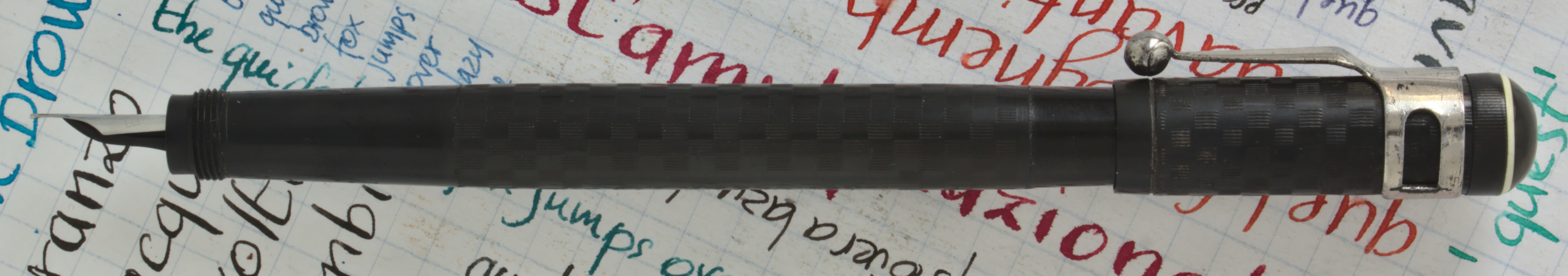 Photo of a pen produced by Olivieri. In checkerboard pattern black chased hard rubber. With accommodation clip.