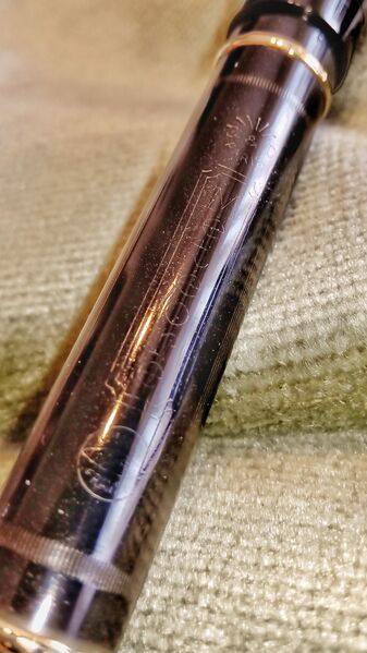 Photo of a pen produced by Météore. Filling system: lever filler. In black hard rubber. Detail of inscription. Model of the 20s, with accommodation clip, bague blanche and the "Unis France" trademark.