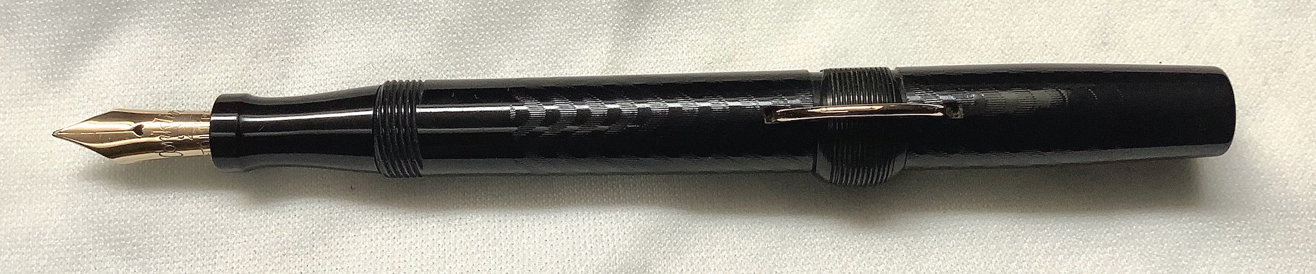 Foto di una penna Conklin. Modello: Crescent Filler 20. Caricamento "crescent filler". Realizzazione in ebanite nera cesellata con motivi ondulati. Misura piccola con pennino n° 2, versione con accommodation clip. Riporta stampigliati i brevetti nº US-448360 e nº US-745481 sul corpo. Contributo di Mirko, (utente forum Mir70).