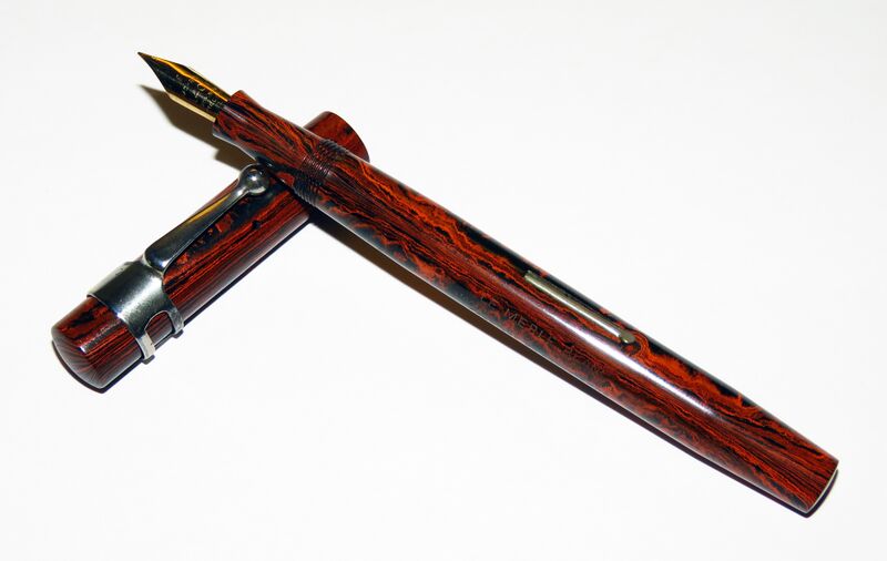 Photo of a pen produced by Merle Blanc (sub-band of Swan). Filling system: lever filler. In mottled hard rubber. French marked model, with accommodation clip.