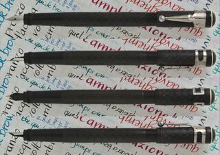 Foto di una penna Olivieri. Realizzazione in ebanite nera cesellata a motivo a scacchiera. Modello con clip di comodo.