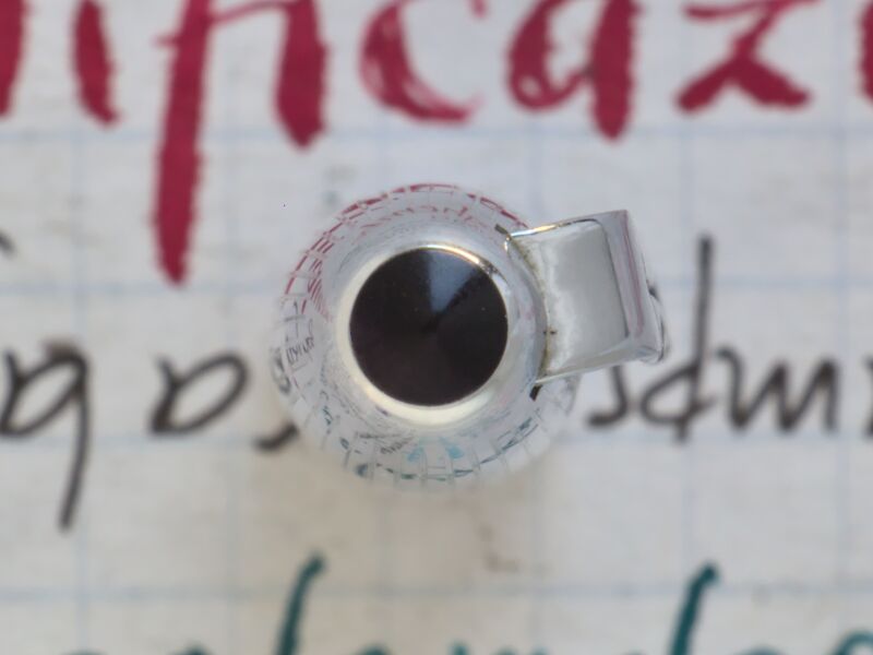 Photo of a pencil produced by Aurora. Model: Aurora 88K. Filling system: piston filler. Detail of cap head. Chromed cap version with black head screw. Serial 2156941.