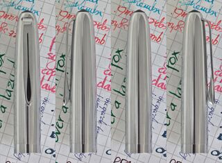 Foto di una penna Aurora. Modello: Aurora 88K. Caricamento a stantuffo. Dettaglio del cappuccio. Versione con cappuccio cromato e testina a vite nera. Seriale 2156941.