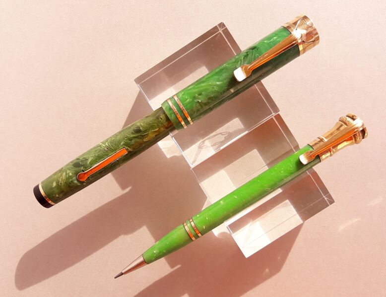 Photo of a pen/pencil set produced by Eversharp. Model: Tulip Clip. Filling system: lever filler. In jade green celluloid. Small size, nib n. 2.