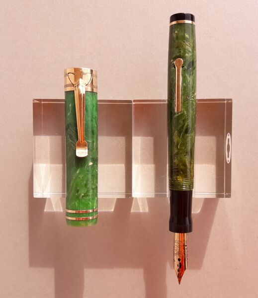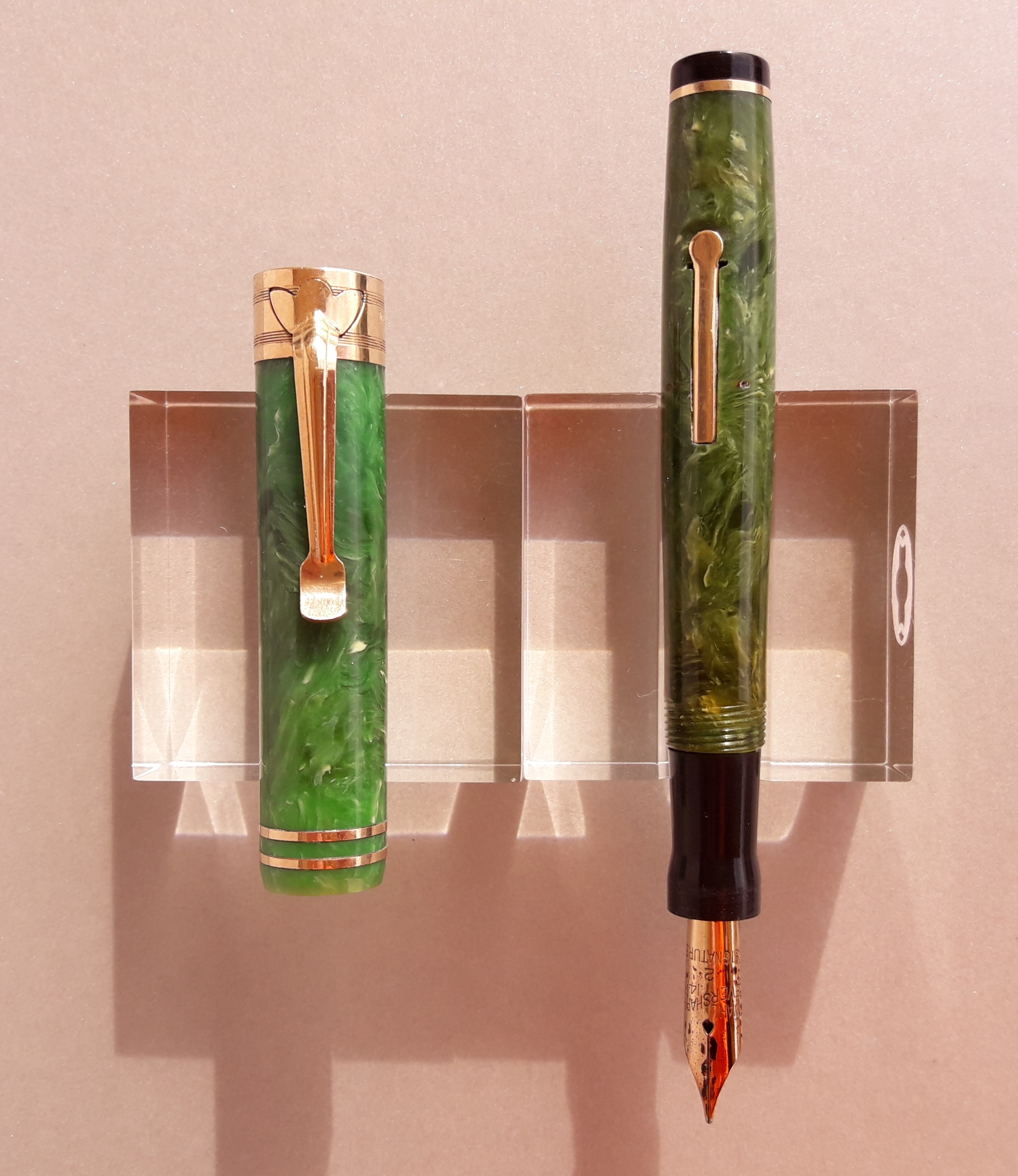 Foto di una penna Eversharp. Modello: Tulip Clip. Caricamento a levetta. Realizzazione in celluloide jade green. Misura piccola, pennino n. 2. Contributo di Giorgio (utente forum Musicus).