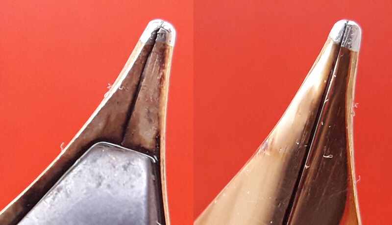 Foto di una penna Eversharp. Modello: Tulip Clip. Caricamento a levetta. Realizzazione in celluloide jade green. Dettaglio del pennino. Misura piccola, pennino n. 2. Contributo di Giorgio (utente forum Musicus).