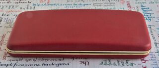 Photo of a pen/pencil set produced by Aurora. Model: Aurora 88K. Filling system: piston filler. In black celluloid. Detail of box. Chromed cap version with black head screw. Serial 2156941.