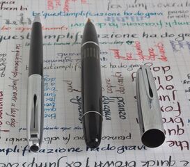 Foto di una penna Aurora. Modello: Aurora 88K. Caricamento a stantuffo. Realizzazione in celluloide nera. Versione con cappuccio cromato e testina a vite nera. Seriale 2156941.
