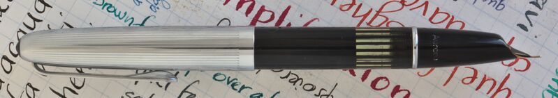 Foto di una penna Aurora. Modello: Aurora 88K. Caricamento a stantuffo. Realizzazione in celluloide nera. Versione con cappuccio cromato e testina a vite nera. Seriale 2156941.