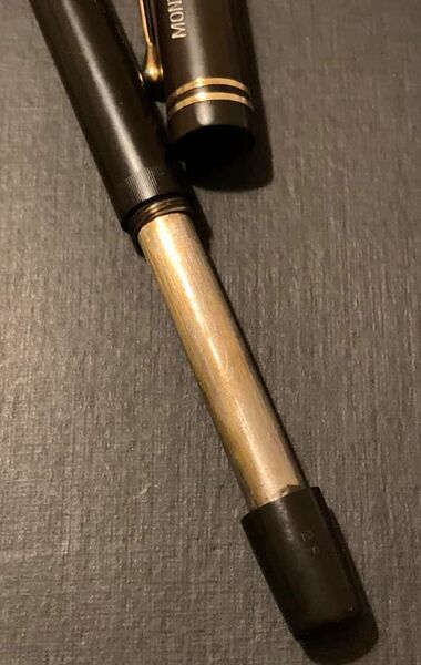 Foto di una penna Montblanc. Modello: Montblanc No. 2. Caricamento pneumatico. Realizzazione in ebanite nera. Dettaglio del caricamento. Veriante con lo stesso caricamento Compressor ma non marcata come tale. Contributo di Amedeo (utente forum solido).