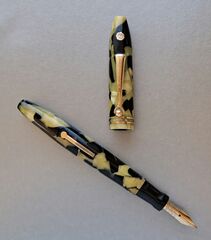 Photo of a pen produced by Eversharp. Model: Equi-Poised. Filling system: lever filler. In "Black and Pearl" celluloid. Second version, created by shortening the first one.