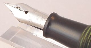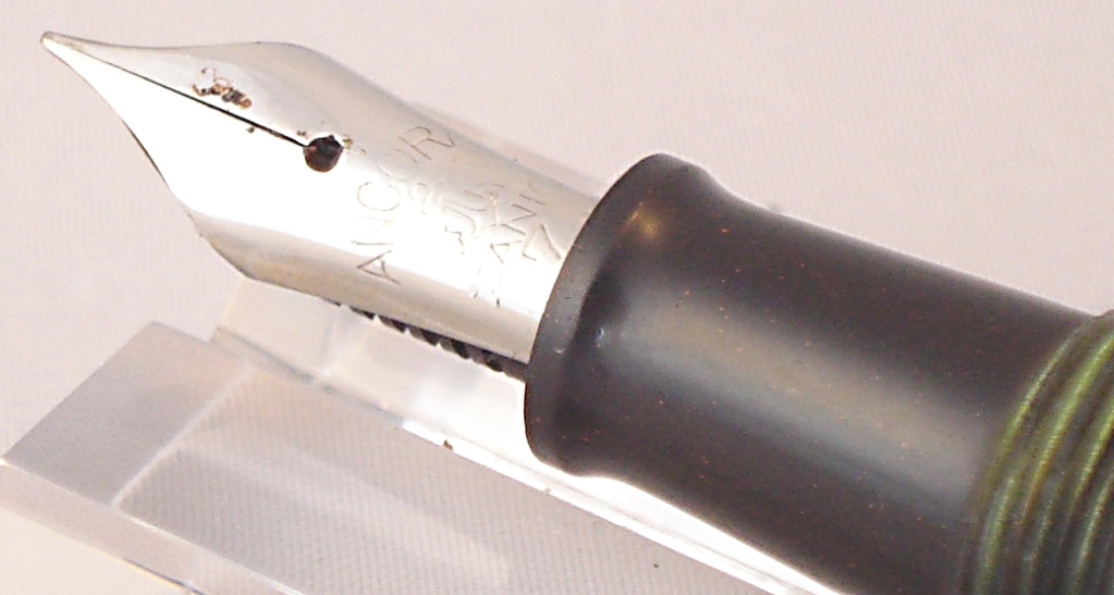 Foto di una stilografica Ancora modello Maxima in celluloide anellata verde. Particolare della sezione e del raro pennino Zanio n° 7. Template:PhotoBy