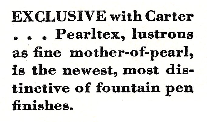 <multilang> it|Estratto dalla scansione di una pubblicità della Carter del 1930 che illustra le qualità del nuovo materiale Pearltex. en|Excerpt from a 1930 Carter advertisement scanning explaining the new Pearltex material. </multilang>